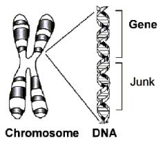 Going down the DNA sequence of a chromosome we encounter gene, junk DNA, gene, junk DNA, etc. In between each gene is junk.